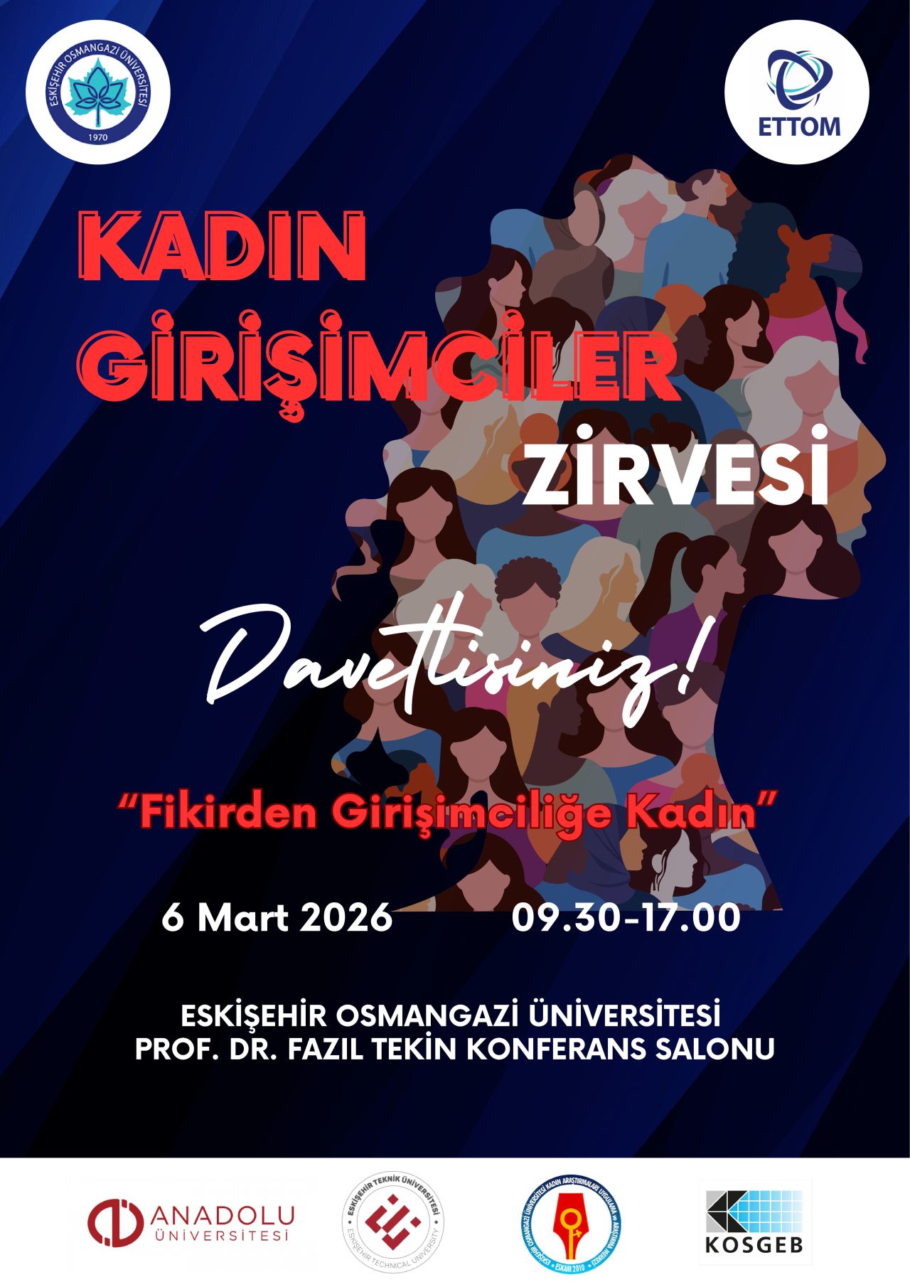 Üniversitemiz Teknoloji Transfer Ofisi (ETTOM), girişimcilik ekosisteminde kadınların rolünü güçlendirmek, yenilikçi iş fikirlerini desteklemek ve başarılı girişim hikayelerini akademik ve profesyonel bir platformda buluşturmak amacıyla "Kadın Girişimciler Zirvesi" düzenlemektedir. 6 Mart 2026 Cuma günü Prof. Dr. Fazıl Tekin Konferans Salonu'nda gerçekleştirilecek zirvede; Anadolu Üniversitesi, Eskişehir Teknik Üniversitesi, Kadın Araştırmaları Merkezi ve KOSGEB temsilcilerinin değerli katılımlarıyla zengin bir içerik sunulacaktır. Etkinlikte, teknoloji ve inovasyon odağında fark yaratan kadın girişimciler, yatırımcılar ve ekosistemin öncü paydaşları bir araya gelerek bilgi ve tecrübe paylaşımında bulunacaktır.