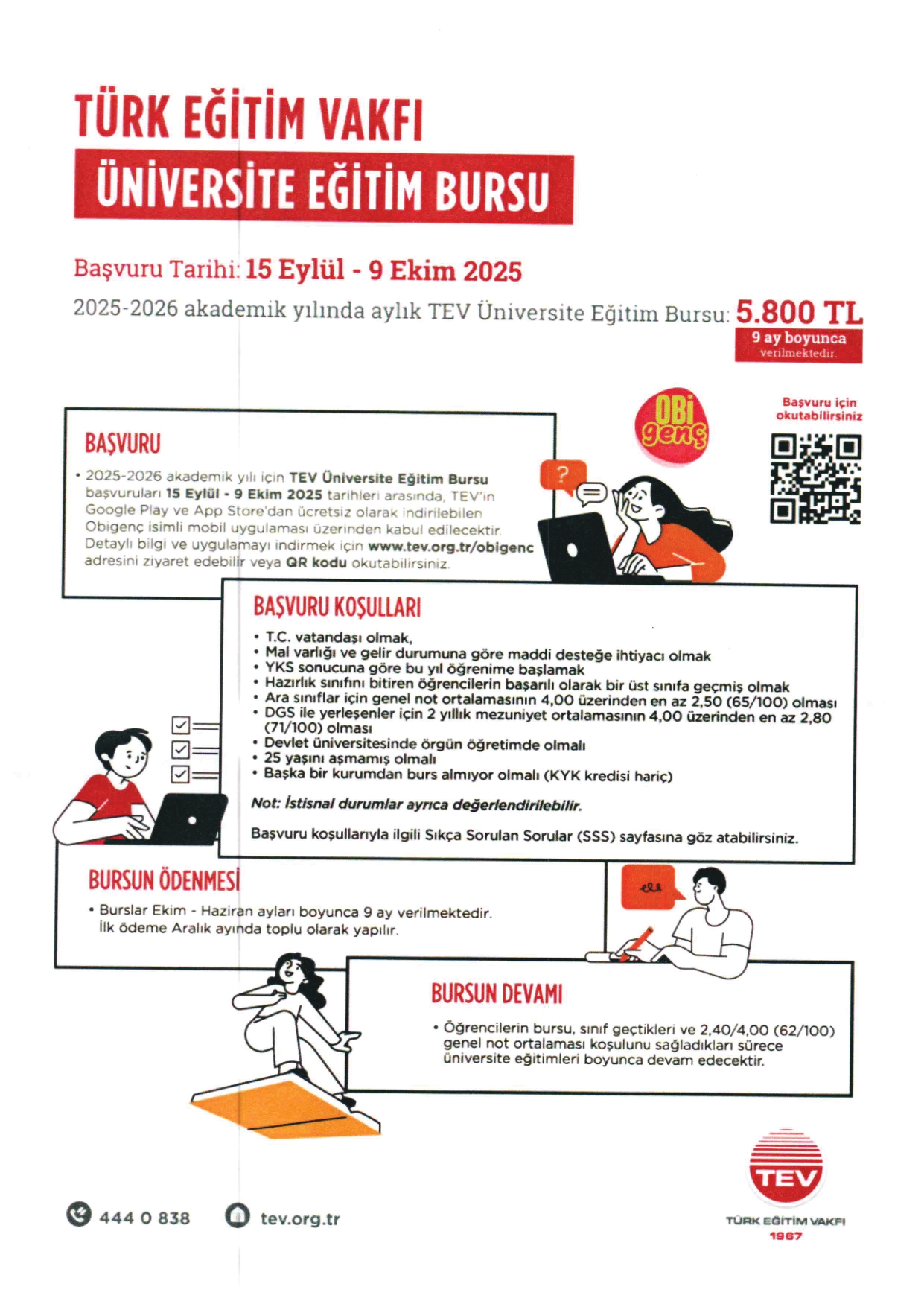 6.10.20252025/2026 Öğretim Yılı Türk Eğitim Vakfı burs başvuruları 15 Eylül 2025 - 09 Ekim 2025 tarihleri arasında alınacak olup burs başvuruları TEV'in dijital platformu olan "obigenç" üzerinden gerçekleştirilecektir.
