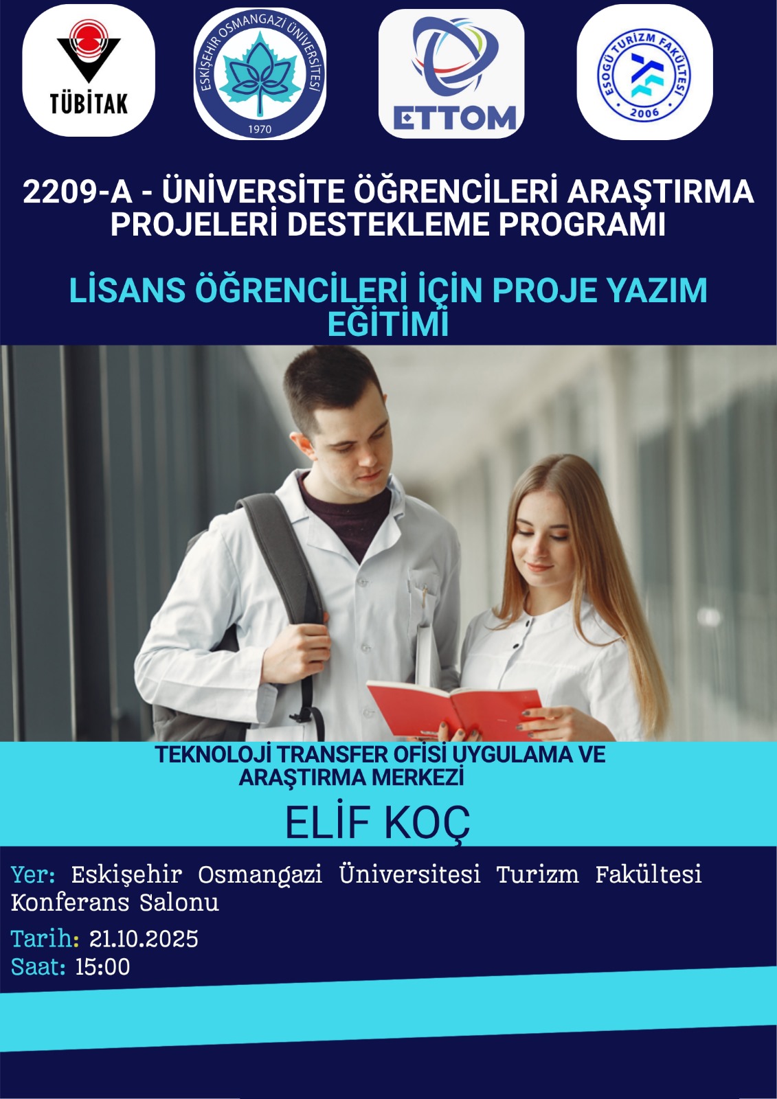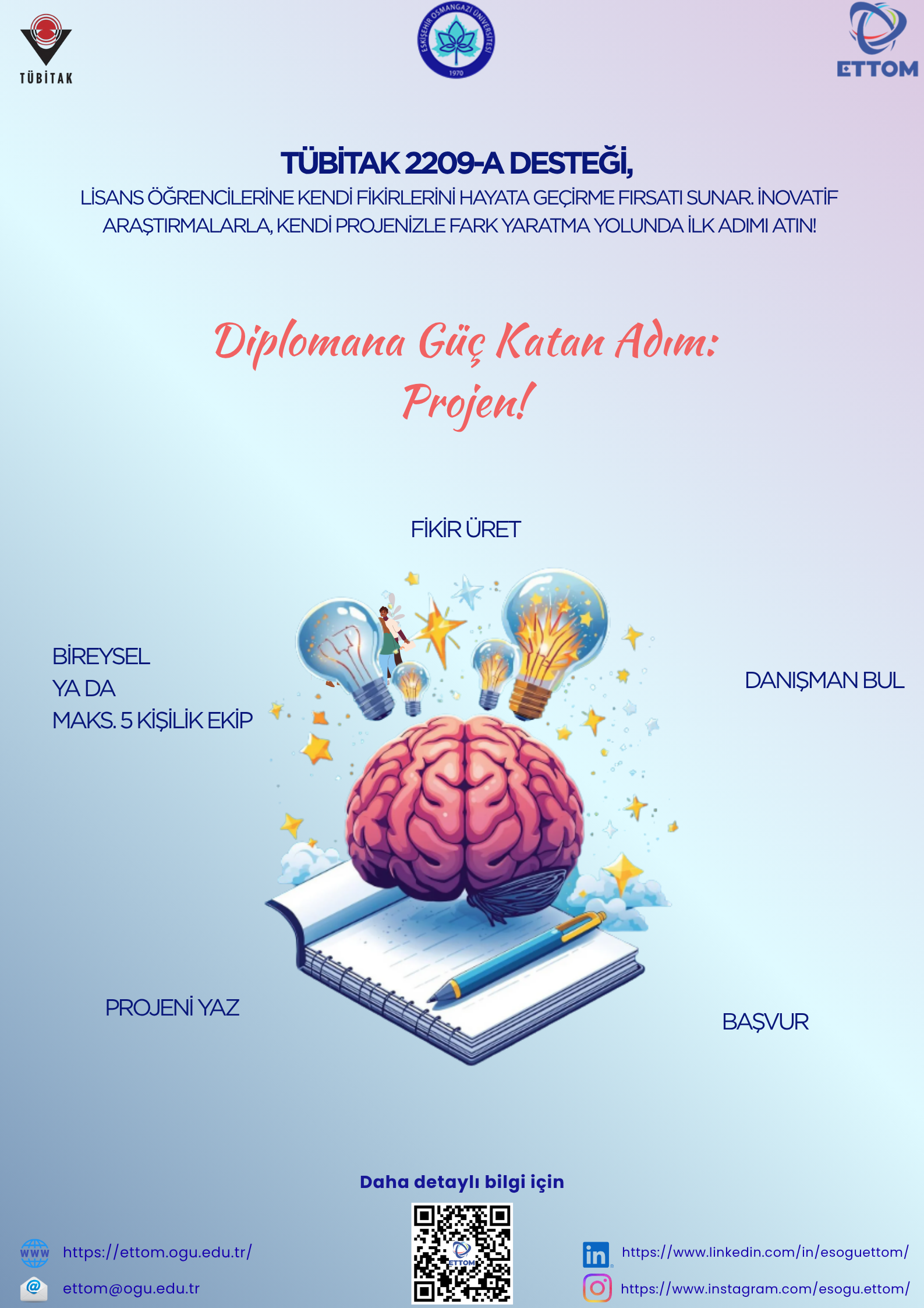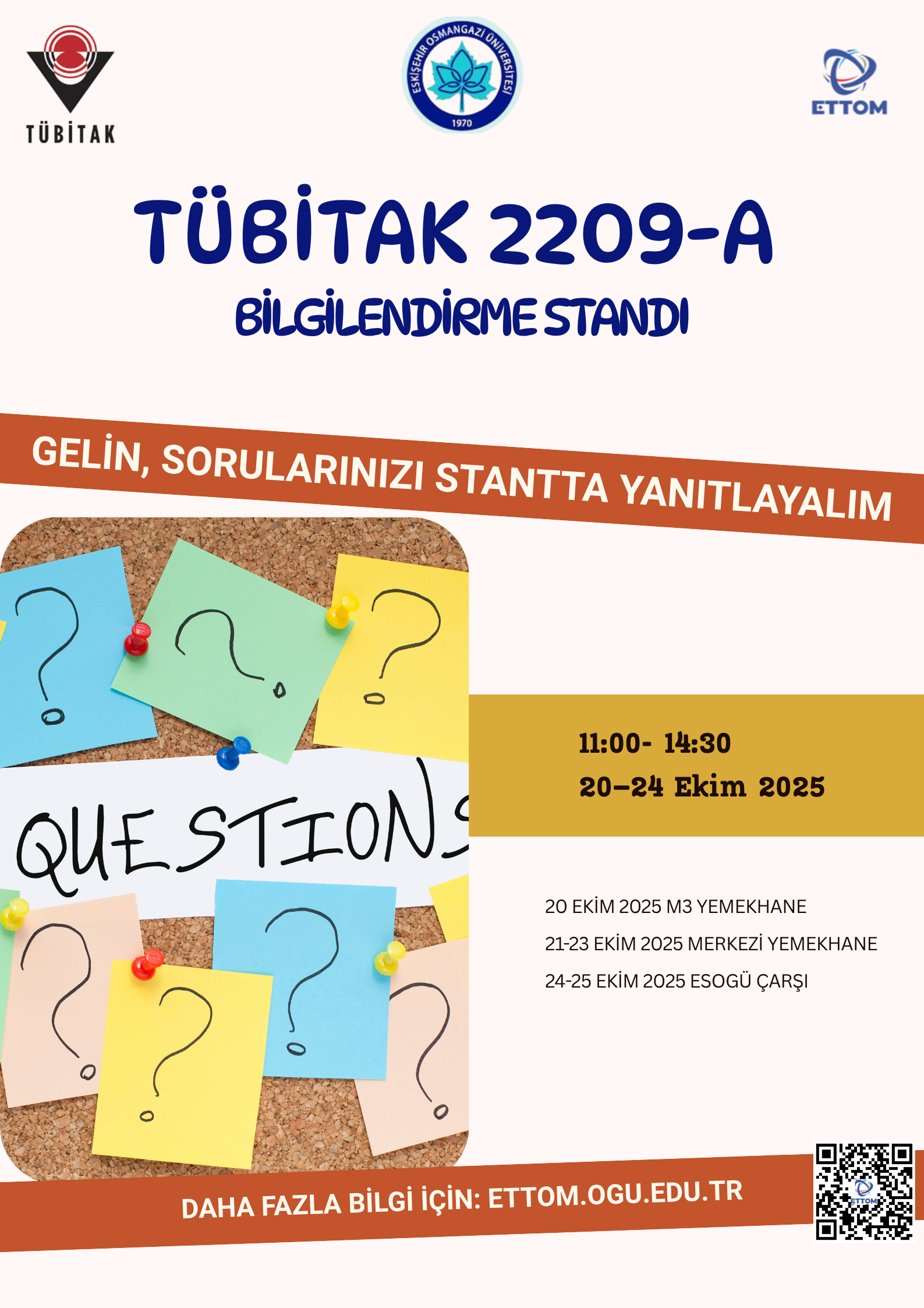 20.10.2025Üniversitemiz ETTOM Proje Ofisi tarafından 20–24 Ekim 2025 haftasında, TÜBİTAK 2209-A Üniversite Öğrencileri Araştırma Projeleri çağrısı kapsamında Merkez Kampüs’te bilgilendirme ve başvuru danışmanlığı stantı açılacaktır.