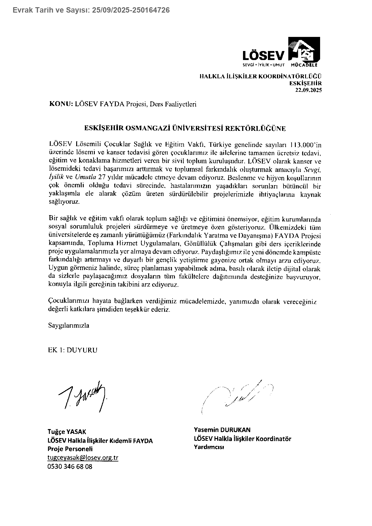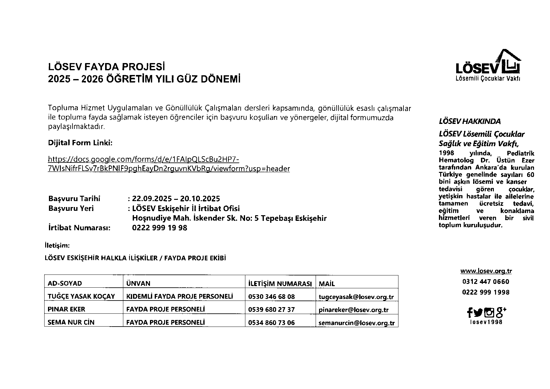 1.10.2025LÖSEV Fayda Projesi hakkında bilgi almak ve proje başvurusu için ekteki dosyaları inceleyebilirsiniz.